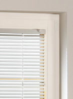 Schrägjalousie mit Classictechnik (25 x 25 mm). Wendestab bzw. Drehknopf an der Oberschiene. Je nach Jalousieform nur eingeschränkt hochziehbar.